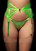 Make your sensuality vibrate with the set of garters designed in neon tones and soft satin elastic adjustable to different sizes, the golden accessories highlight the luxury of this piece. Find a bra, garter belt and thong from the same set.
